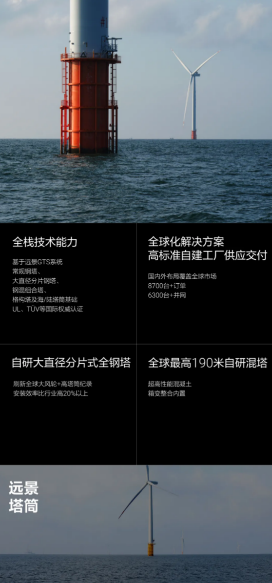 作为全球首个低风速风机、高塔架技术的倡导者,远景塔筒具备全栈技术能力,可以提供基于远景GTS系统的常规钢塔、大直径分片钢塔、钢混组合塔、格构塔及海/陆塔筒基础,保障全球风电塔架与基础安全高效,产品获UL、TÜV等国际权威认证,供应链遍布全国25个省份,国内外布局覆盖全球市场。在高塔领域,远景市场业绩和技术能力遥遥领先,总订单超8700台,累计交付并网超6300台。远景自研大直径分片式全钢塔不断刷新全球大风轮+高塔筒纪录,安装效率比行业高20%以上;190米自研混塔创造全球混塔新高度,并首次应用超高性能混凝土,配置全球最大吨位XCA4000吨轮式吊装设备,满足-40~+50℃环境适应性。