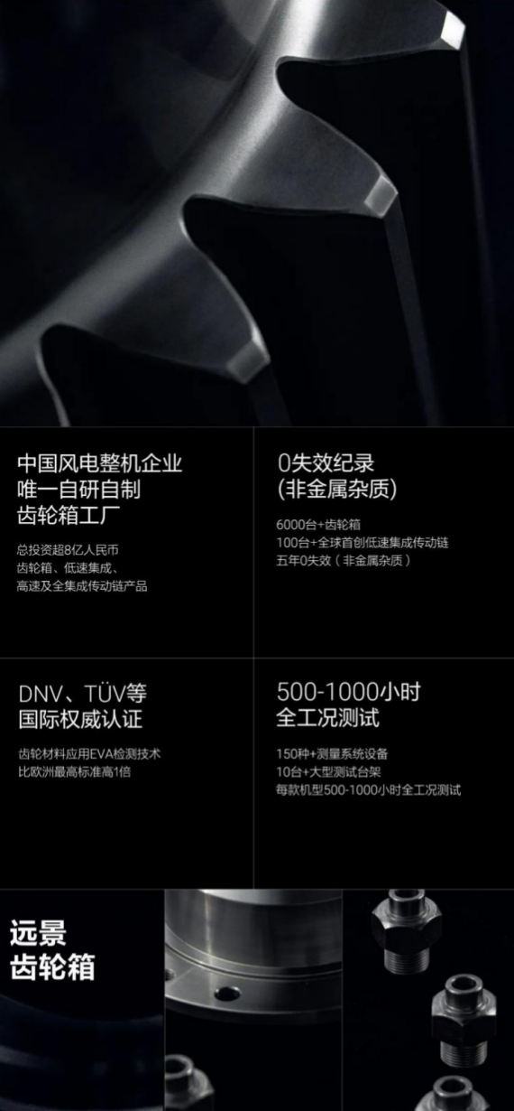 远景是唯一拥有齿轮箱工厂的中国风电整机企业,远景齿轮箱(EnG)于2017年开启自研之旅,2019年投建工厂实现自制,2024年主导建设传动技术二期工厂。一二期工厂总投资超8亿人民币,占地面积超6万平方米,批量能力涵盖最高20MW齿轮箱和低速集成传动链产品,以及最高30MW高速和全集成传动链产品。远景齿轮材料应用EVA检测技术,检测标准比欧洲最高标准高1倍,每一款样机至少经历500-1000小时全工况测试,并通过国际权威机构DNV和TÜV认证。目前远景累计产出100余台低速集成传动链产品,并在3个省份的4个风场批量应用58台,超6000台远景齿轮箱投运五年来保持0失效(非金属杂质)纪录。