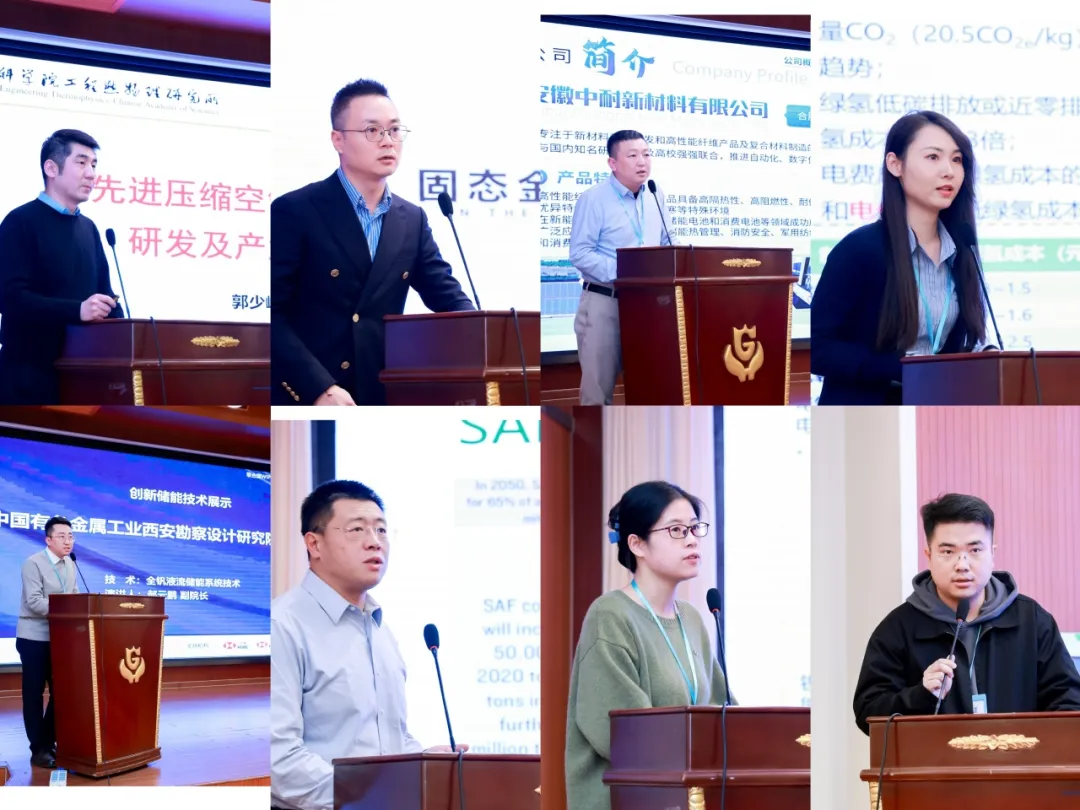 八家储能技术企业的代表分别上台进行了技术展示,并与产业方与投资方点评专家进行了交流互动。八位发言代表按出场顺序依次为:中储国能(北京)技术有限公司市场部总经理郭少峰、天津新氢动力科技有限公司总经理张凯、安徽中耐新材料有限公司董事长曹红枫、青岛质子动力科技有限公司行政科技部经理陈静、中国有色金属工业西安勘察设计研究院有限公司绿色双碳院副院长郝云鹏、上海碳消峰生能源科技有限公司低碳战略顾问阿庆兴、好风光储能技术(成都)有限公司产品经理何颖源、清源合一(杭州)科技有限公司解决方案经理李响。