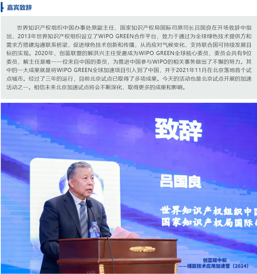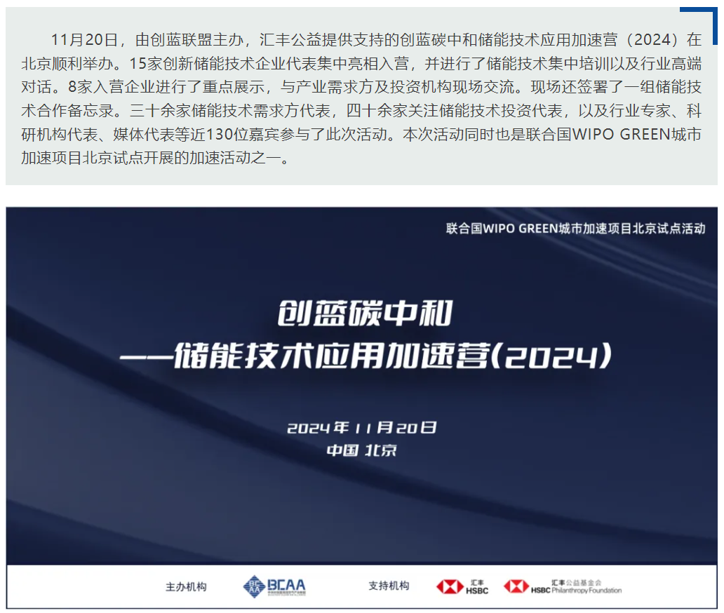 本次活动现场同时也邀请到了来自产业方的伙伴,包括来自中石化、中海油、国电投、国家电网、华能、华润、中节能、中能建、五矿、国新、中冶、光大、京能集团、中关村发展集团等大型央国企代表;来自腾讯、美团、盛虹、协鑫、金风、远景、中电兴发等大型民营企业代表;来自沙特阿美集团、淡马锡集团、福德莱姆集团等国际知名产业方的代表。此外,加速营还邀请到来自红杉中国、中信资本、经纬创投、启明创投、中科创星、华控基金、力合创投、博正资本、北航长鹰创投、新材智资本等四十余位投资机构的代表。本次加速营活动同时也是联合国WIPO GREEN中国城市加速项目北京试点的活动。北京绿金院是本次活动的协办机构,并在汇丰公益的支持下,与创蓝联盟共同开展金融支持储能行业加速发展和应对气候变化项目,负责金融支持储能加速模块。主办方创蓝联盟表示,期待通过本次活动,能够为入营企业,产业方,投资方的伙伴们搭建一个良好的交流平台,促进入营企业在创新绿色科技储能领域更好的发展。