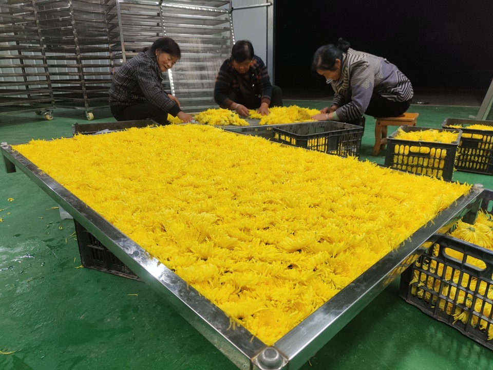 花朵的采摘只是第一步,更重要的是后期加工和销售。采摘结束后,驻村帮扶工作队立即组织村民开展金丝皇菊的挑拣、晾晒和烘干等工序。烘干过程中,要将金丝皇菊均匀摆放在烘干架上,严格控制烘干温度和时间,确保每一朵金丝皇菊都能保持最佳的色泽和形状。经过多道工序的精心处理,金丝皇菊的品质得到了有力保障,为后续的销售工作打下了坚实基础。