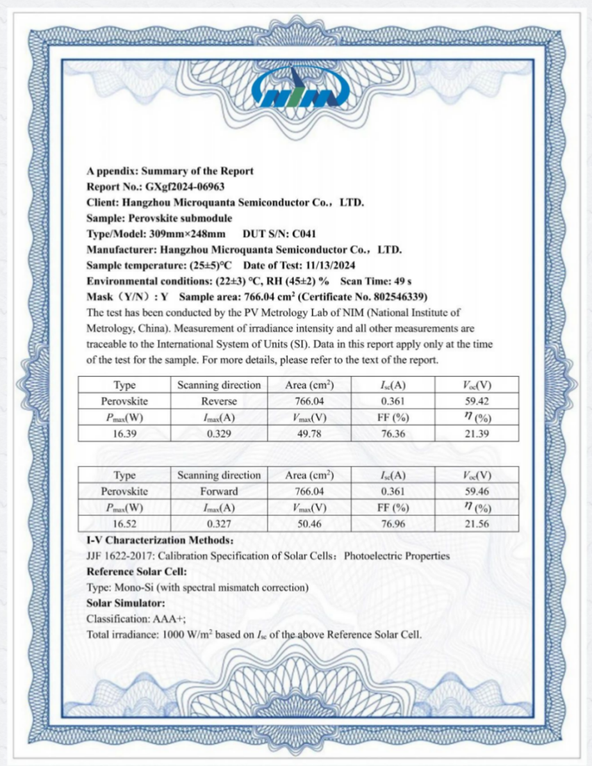 图1 中国计量院钙钛矿中型组件转化效率认证报告