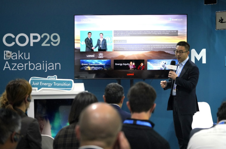 当地时间11月15日下午,隆基绿能联合深石集团在COP29蓝区的“生物圈三号”主题馆举办了题为“SOLAR FOR ALL——应对气候变化:绿色创新加速能源公正转型”的专场活动,展示了隆基绿能在清洁能源领域的最新科技成果和项目进展。此外,隆基绿能还在联合国难民署(UNHCR)、中国电力企业联合会(CEC)、全球能源互联网发展合作组织(GEIDCO)、世界经济论坛(WEF)、能源基金会(EF)及相关NGO的代表们参与的圆桌论坛上,分享了隆基关于“能源公平”的故事,探讨如何助力气候脆弱地区增强气候韧性。
