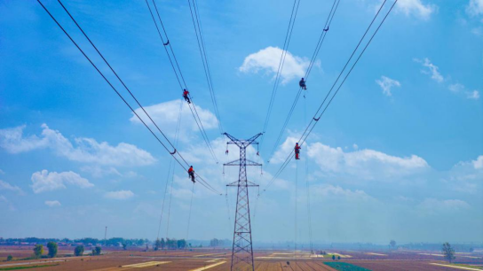 ▲国网菏泽供电公司工作人员在220千伏仿屯线开展防舞动间隔棒安装施工。