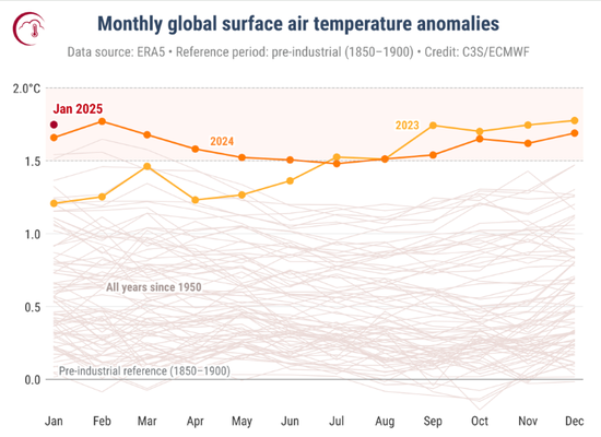根据欧盟气候监测机构哥白尼气候变化服务局周四发布的报告,上月的全球平均地表气温为13.23℃,比工业化前的平均气温高出1.75℃。这是自1940年有记录以来最热的1月份。