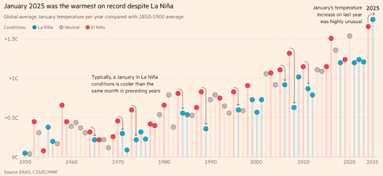 负责监督哥白尼项目的欧洲中期天气预报中心气候战略负责人Samantha Burgess也表示,“1月是又一个令人惊讶的月份。尽管热带太平洋地区出现了拉尼娜现象,对全球气温产生了暂时的降温效应,但过去两年的创纪录高温仍在持续。”