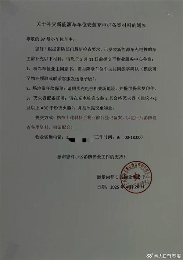 5月6日消息,有博主爆料称,一车友投稿,自己收到了他们小区物业下发的“关于补交新能源车位安装充电桩备案材料的通知”。