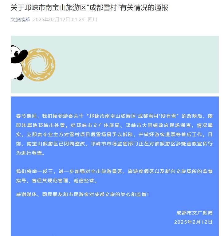2月12日,成都市文化广电旅游局通过微信号“文旅成都”通报邛崃市南宝山旅游区“成都雪村”没有雪称,责令业主方对雪村项目假雪场景予以拆除,目前南宝山旅游区已闭园整改。