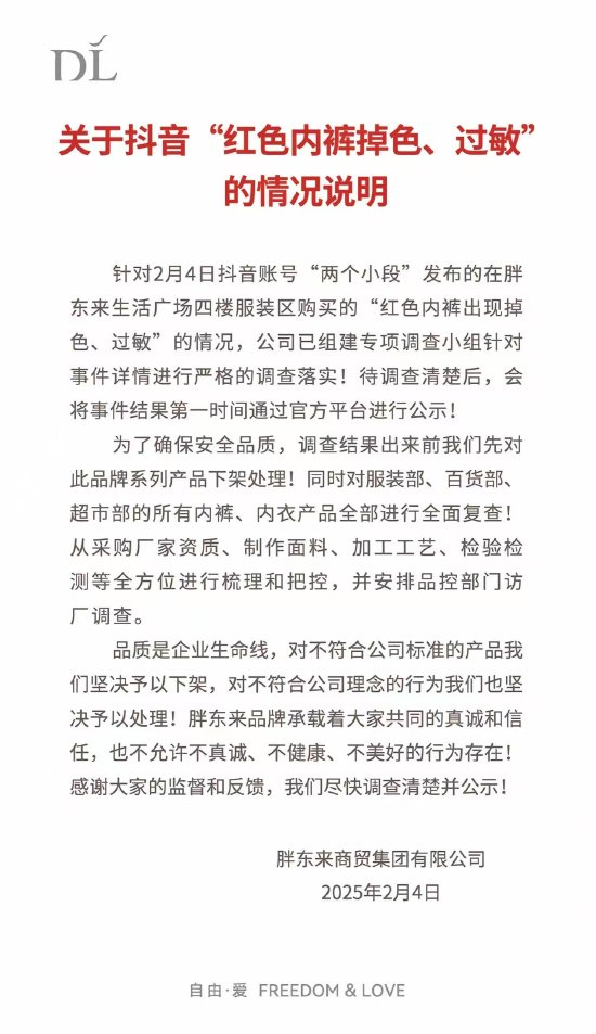 胖东来发布情况说明称,公司已组建专项调查小组针对事件详情进行严格的调查落实,待调查清楚后,会将事件结果第一时间通过官方平台进行公示。为了确保安全品质,调查结果出来前先对此品牌系列产品下架处理,同时对服装部、百货部、超市部的所有内裤、内衣产品全部进行全面复查。从采购厂家资质、制作面料、加工工艺、检验检测等全方位进行梳理和把控,并安排品控部门访厂调查。