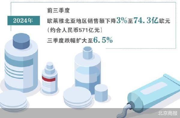 反观欧莱雅整体业绩,则难言乐观。近两年,欧莱雅增长放缓,尤其是曾支撑整体业绩增长的亚洲市场及中国市场,出现多季度下滑。根据财报数据,2024年前三季度,欧莱雅销售额达324.06亿欧元(约合人民币2494.88亿元),同比增长6%。其中,中国所在的北亚地区成为唯一销售额下滑的市场。根据财报数据,前三季度,欧莱雅北亚地区销售额下降3%至74.3亿欧元(约合人民币571亿元),三季度跌幅扩大至6.5%。2024年上半年,欧莱雅北亚市场销售额54.75亿欧元,同比下降3.1%。另外,二季度销售额27.52亿欧元,同比下降2.4%;而在一季度,欧莱雅北亚地区销售额同比下降1.1%。