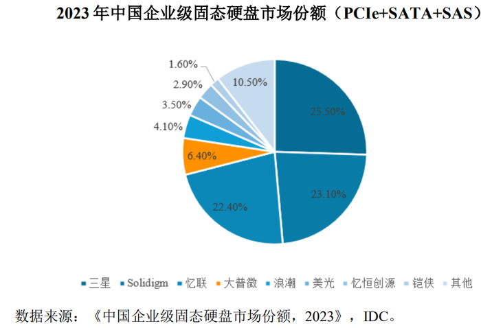 根据大普微招股书中引用的IDC数据,2023年中国企业级固态硬盘市场份额排名靠前的企业依次为三星(25.5%)、SK海力士旗下的Solidigm(23.1%)、忆联信息(22.4%)、大普微(6.4%)、浪潮(4.1%)、美光(3.5%)、忆恒创源(2.9%)和铠侠(1.6%),大普微排名第四,在国内企业中仅次于忆联信息排名第二。