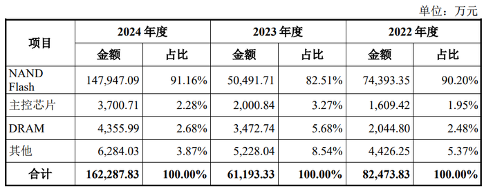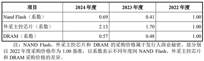 2022年以来,NAND flash采购价格波动较为剧烈,以价格系数计算,公司2022年、2023年和2024年NAND flash采购价格系数分别为1、0.41和0.69。