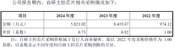 报告期内,大普微自研主控芯片对外采购金额分别为974.12万元、8419.67万元和5821.02万元,同时,由于不同年度采购单价系数不同,假设2022年主控芯片采购单价为1元/颗,则对应2022年、2023年和2024年采购芯片颗数分别为974.12万、9151.82万和7973.97万。