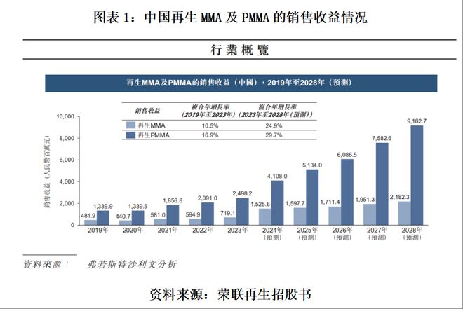 不过,时代商业研究院注意到,如图表1所示,根据荣联再生招股书引用的数据,中国2024年再生MMA及PMMA的销售收益估测仅为41.08亿元,2025年估测为51.34亿元,整体市场规模或较为有限。
