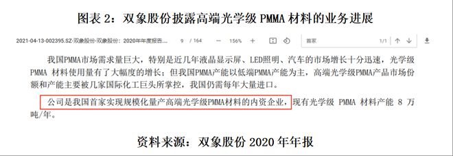 在2024年年报中,双象股份依然表示其系国内首家实现规模化量产高端光学级PMMA材料的内资企业。
