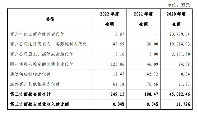 此外,随着林氏家居海外业务的快速发展,在阿里巴巴国际站渠道下林氏家居部分海外客户因汇款便利等综合因素的影响,选择通过第三方银行账户向林氏家居回款,金额及占比较低。上述第三方回款不存在通过林氏家居关联方代付的情形。