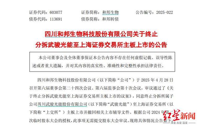 4月28日晚间,和邦生物(603077.SH)披露公告称,公司决定终止分拆所属子公司四川武骏光能股份有限公司(以下简称“武骏光能”)至上交所主板上市。