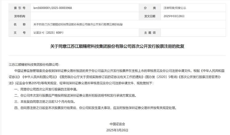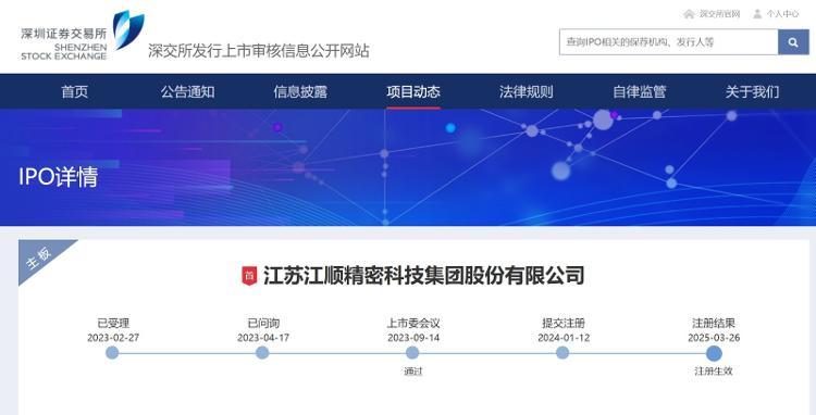 2023年,江顺科技再次递交招股书,2023年9月获深交所上市委会议通过。2024年1月,江顺科技审核状态显示为“提交注册”,随后又在9月提交了两版注册稿,直到2025年3月26日才终于注册生效。