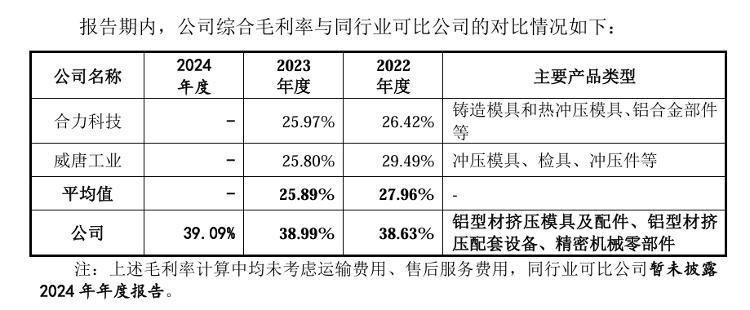 江顺科技称,报告期内,公司各主要产品在行业内的直接竞争对手均为非上市公司,无公开披露的财务数据。因此公司选取同样以金属模具为主要产品,技术与工艺较为接近,主要原材料种类相近,且营业收入规模较为接近的企业作为同行业可比公司。2022年和2023年,同行业毛利率平均值分别为27.96%和25.89%,明显低于江顺科技。