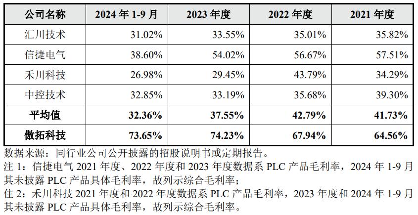 对公司明显超高毛利率水平的合理性,傲拓科技解释称,公司毛利率较高且高于PLC同行业公司,主要是由于产业链位置、产品类型、客户类型、应用领域、销售模式和同行业公司存在一定差异,在中大型PLC细分领域内尚未面临国内企业的激烈竞争,可参照国外品牌进行定价,利润空间较高,且“轻资产”的经营模式进一步降低了成本。