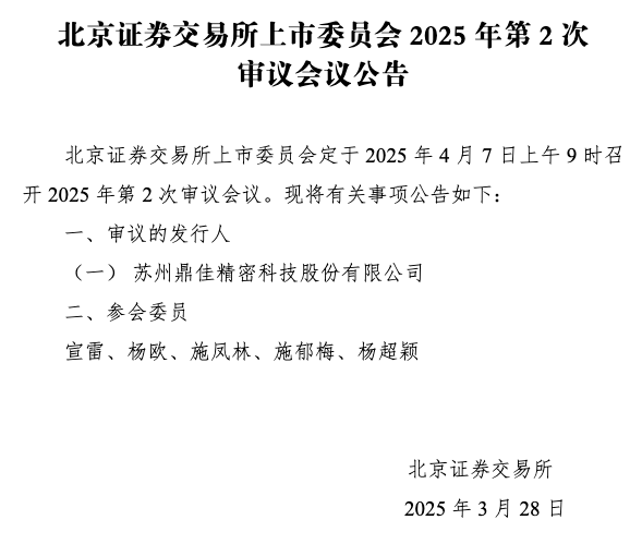 北交所3月28日公告,苏州鼎佳精密科技股份有限公司(以下简称”鼎佳精密“)IPO将于2025年4月7日上会审议。