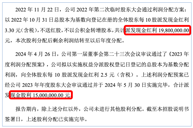 值得一提的是,在IPO前两年,即2022年和2024年公司两次突击分红合计3480万元,其中超3100万元流入实控人家族口袋。