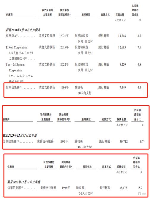 此外,令人极为费解的是,对于信华信与信华信集团之间的采购数据,公司似乎存在自我打脸的情况。在信华信申报稿中的关联交易的历史金额中,公司披露,报告期内,信华信就共享服务向信华信集团支付的费用总额分别为4070万元、5890万元、3310万元,而这与上述同期前五大供应商中的数据分别相差了222.5万元、2818.8万元、2565.1万元。