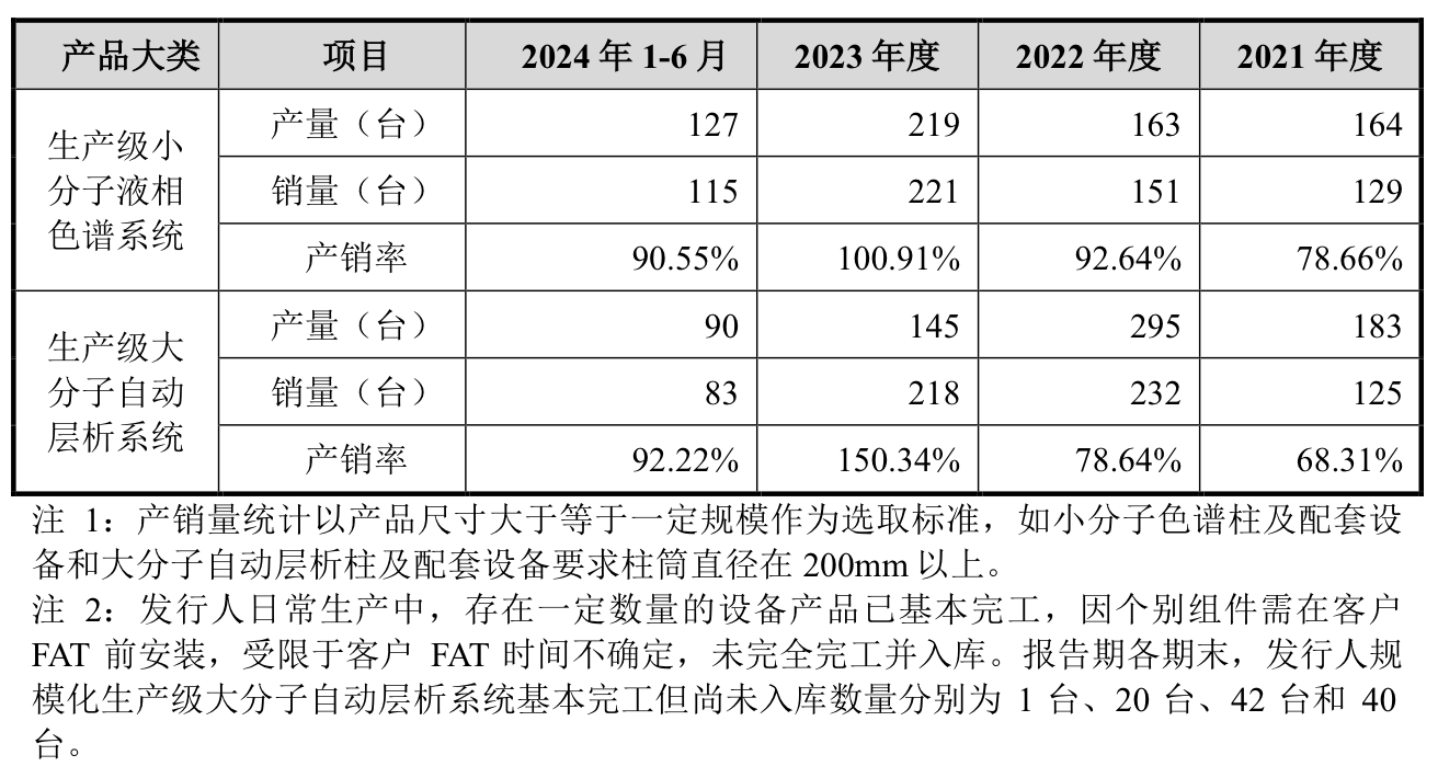 界面新闻注意到,汉邦科技在说明书中提及的产能利用率,是通过工时算的,2024年上半年的产能能利用率为86.5%,无法直观看到产能对应台数。从产销看,2024年上半年公司生产级小分子液相色谱系统产量127台,产销率90.55%;生产级大分子自动层析系统产量90台,产销率92.22%。