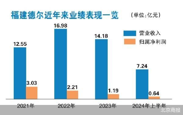 北京商报记者注意到,净利下滑的同时,2021—2023年及2024年上半年,福建德尔主营业务毛利率也整体走低,分别为41.46%、29.75%、16.79%、17.73%。