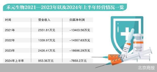 根据公司最新更新的财务资料,2021—2023年以及2024年上半年,禾元生物实现的营业收入分别约为2551.81万元、1339.97万元、2426.41万元、953.36万元,对应实现的归属净利润分别约为-1.34亿元、-1.44亿元、-1.87亿元、-7859.2万元,报告期内持续亏损超5亿元。