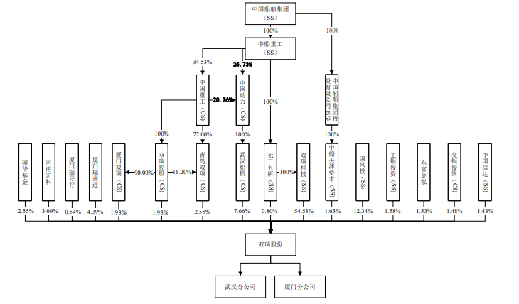 招股书显示,双瑞科技持有公司54.53%股权,为公司的控股股东。武汉船机持有双瑞股份2450.86万股股份,占本次发行前公司总股本的7.66%。中国船舶集团通过双瑞科技、武汉船机、青岛双瑞、厦门双瑞、双瑞控股、中船天津资本、七二五所合计间接持有公司71.07%股份,为公司实控人。