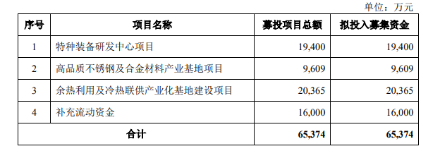 本次IPO募投项目主要用于特种装备研发中心项目、高品质不锈钢及合金材料产业基地项目、余热利用及冷热联供产业化基地建设项目。