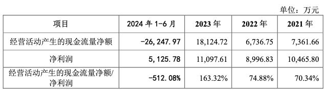 记者注意到,该公司2024年上半年经营性现金流转为负值。报告期内,公司经营性现金流净额分别为7361.66万元、6736.75万元、1.81亿元和-2.62亿元。