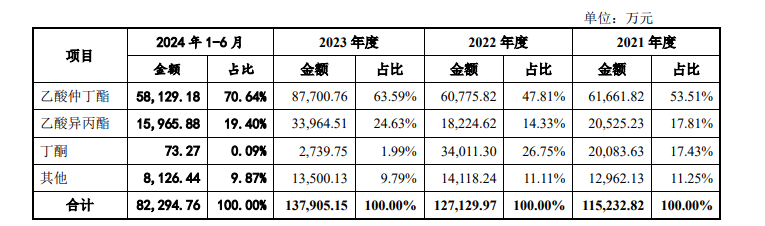 中创化工核心业务为新型环保溶剂的生产、研发和销售,主要产品包括乙酸仲丁酯、乙酸异丙酯和丁酮。其中乙酸仲丁酯是第一大主营产品,报告期内主营业务收入占比分别为53.51%、47.81%、63.59%和70.64%。