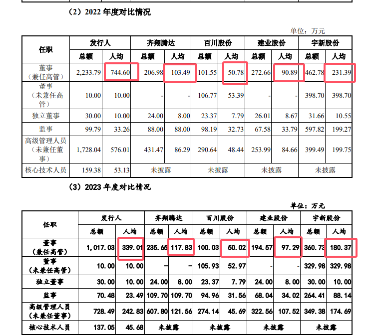 根据中创化工披露,2022年,上述4家公司兼任高管的董事人均薪酬分别为103.49万元、50.78万元、90.89万元和231.39万元,未兼任董事的高管人均薪酬分别为86.29万元、48.44万元、84.66万元和199.75万元。中创化工2022年董事兼高管、高管的人均薪酬744.60万元、576.01万元是上述公司的数倍之多。