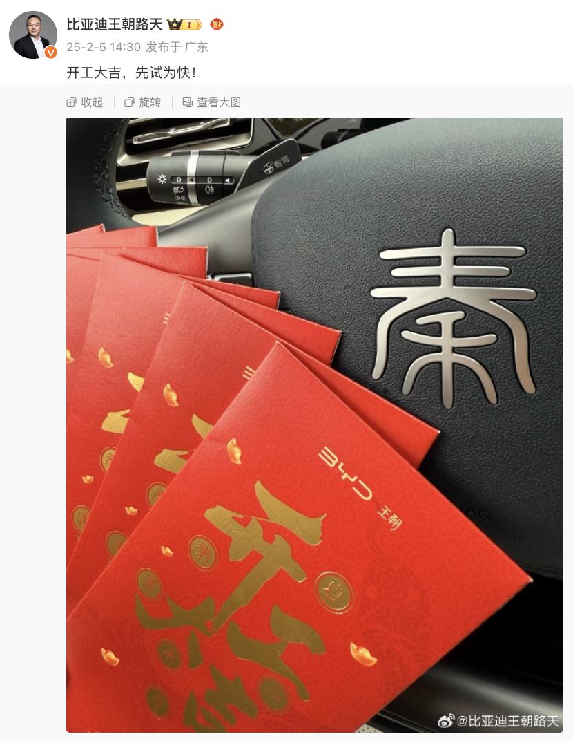 2月5日,比亚迪王朝网销售事业部总经理路天在社交媒体平台发文:“开工大吉,先试为快!”并晒出两张比亚迪车的方向盘的照片,其中一张为“秦系列”车型的方向盘,方向盘后方的拨片上写着“智驾”二字。