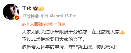 2月7日消息,昨日有消息称,小米眼镜官微已经上线,业内猜测小米即将入局百镜大战,引发广泛关注。今日上午,小米集团公关部总经理王化微博发文表示,“大家如此关注小米眼镜十分欣慰,在此感谢大家,不过非常抱歉要扫大家的兴了,该帐号为多年前申请,并非新上线,特此说明!”