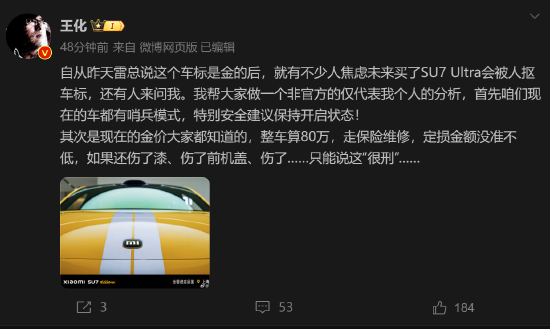 2月6日上午消息,小米公关部总经理王化发文表示,自从昨天雷军透露SU7 Ultra车标是金的后,就有不少人焦虑未来买了SU7 Ultra会被人抠车标。王化称,“我帮大家做一个非官方的仅代表我个人的分析,首先咱们现在的车都有哨兵模式,特别安全建议保持开启状态。”