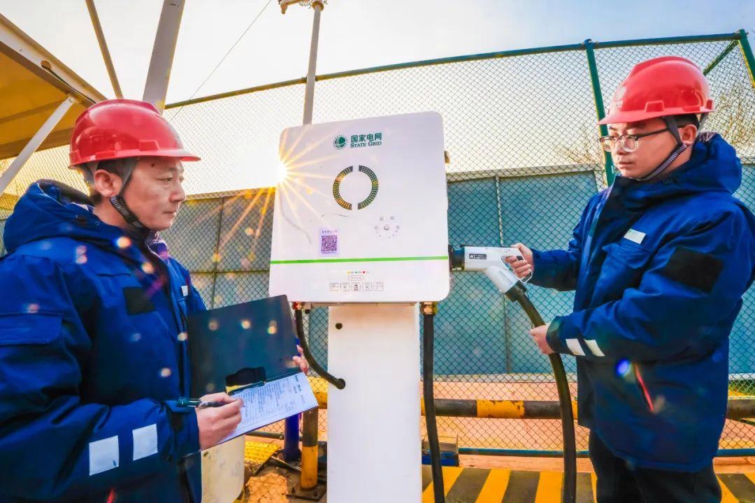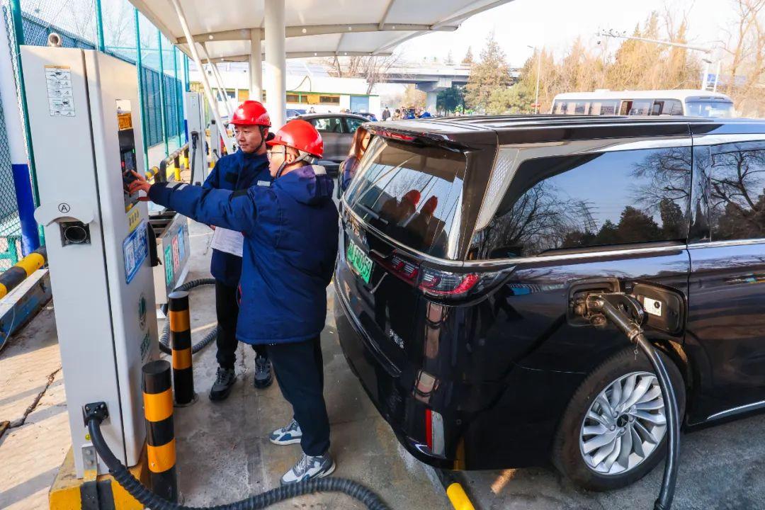 1月23日下午,在京藏高速公路百葛服务区(进京方向)电动汽车充电站内,前来充电的车辆络绎不绝,两名电力运维人员一边巡检充电设施,一边为需要帮助的车主提供服务。