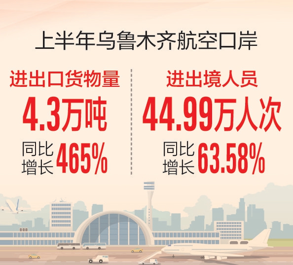 本报乌鲁木齐8月9日讯 石榴云/新疆日报记者陈蔷薇从乌鲁木齐天山机场海关获悉:上半年,乌鲁木齐航空口岸进出口货物量4.3万吨,同比增长465%;进出境人员44.99万人次,同比增长63.58%,呈现客货两旺态势。