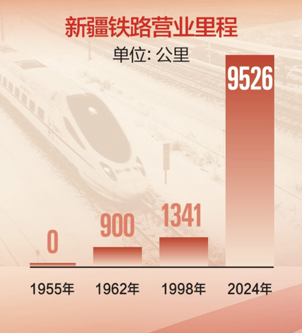 70年间,新疆铁路营业里程从零公里增加至9000多公里,南北疆形成两个铁路环线、进出疆通道扩展至三条,为便捷的物流运输打下了牢固的基础。
