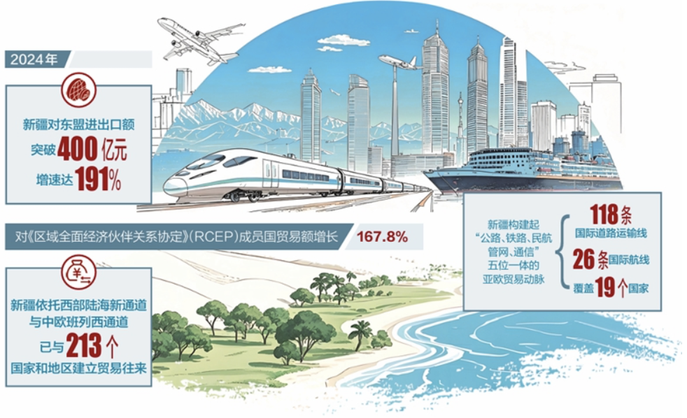笛声长鸣,班列飞驰。在乌鲁木齐国际陆港区,满载机械设备与纺织品的列车正驶向东南亚;在北部湾,新疆的优质林果与番茄跨越山海登上货轮抵达东盟市场。在东盟连续5年稳居中国第一大贸易伙伴的背景下,作为“一带一路”核心区,中国新疆正以全方位开放姿态深化与东盟经贸合作。2024年,新疆对东盟进出口额突破400亿元,增速达191%;对《区域全面经济伙伴关系协定》(RCEP)成员国贸易额增长167.8%。