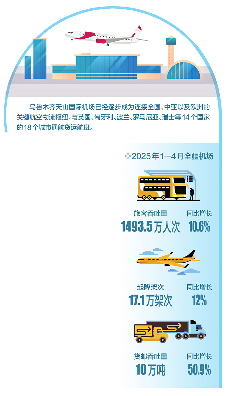 2025年1—4月,全疆机场旅客吞吐量1493.5万人次、起降架次17.1万架次、货邮吞吐量10万吨,同比分别增长10.6%、12%、50.9%。这些成绩充分彰显新疆作为“一带一路”核心区的物流枢纽潜力,为深化区域合作奠定坚实基础。