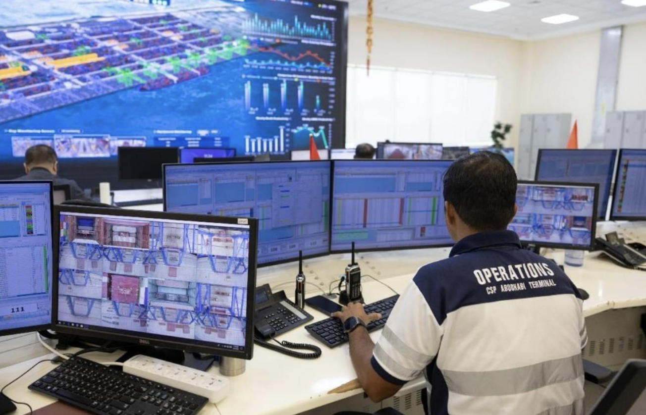 中远海运港口阿布扎比码头控制室内,工作人员通过数字孪生系统跟进工作进度。中远海运港口阿布扎比码头供图