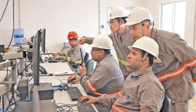 中巴双方员工在玛瑞蒂光伏项目升压站的主控室内查看设备运行情况。