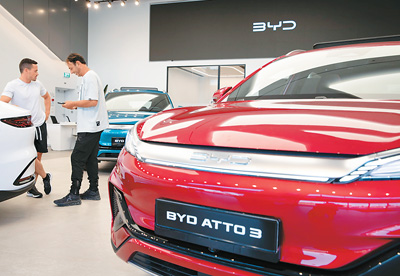 在以色列特拉维夫一家比亚迪销售点拍摄的SUV Atto 3电动车。新华社记者 陈君清摄