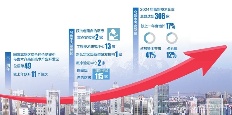 在2024年12月23日工业和信息化部发布的2024年国家高新区综合评价结果中,乌鲁木齐高新技术产业开发区(以下简称“乌鲁木齐高新区”)在全国178个国家级高新区的综合排名里位居第49,较上年跃升11个位次,首次挺进“前50强”,创下近5年来的最高排名。