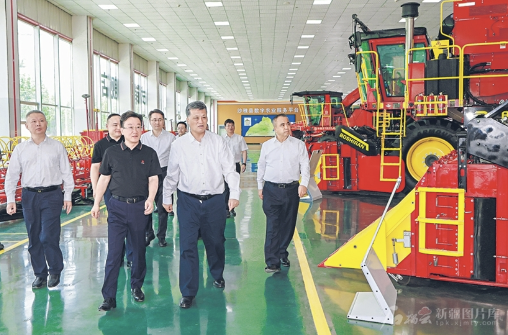 5月25日,自治区党委书记、兵团党委第一书记、第一政委马兴瑞,自治区党委副书记、自治区主席艾尔肯·吐尼亚孜在阿克苏地区沙雅县、新和县调研。这是马兴瑞、艾尔肯·吐尼亚孜来到沙雅钵施然智能农机有限公司,察看产品展示,了解企业发展情况。石榴云/新疆日报记者崔志坚摄