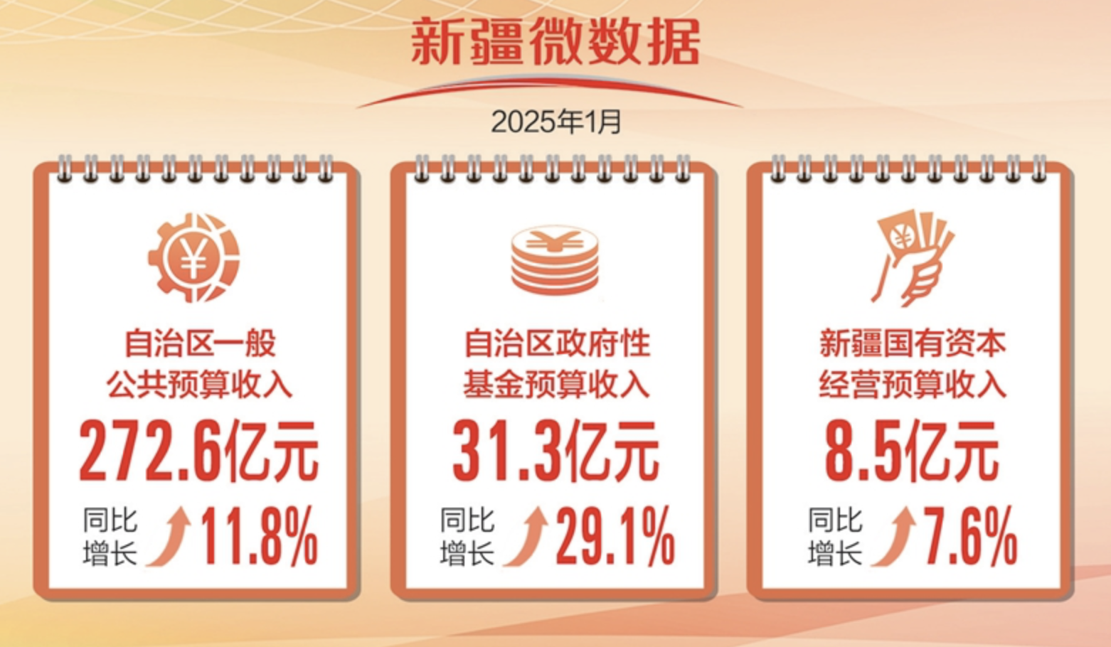 近日,新疆维吾尔自治区财政厅公布2025年1月新疆财政预算执行情况。数据显示,1月,新疆财政“三本账”收支全部实现正增长,取得首月“开门红”,为自治区经济社会发展开好局、起好步奠定了坚实基础。