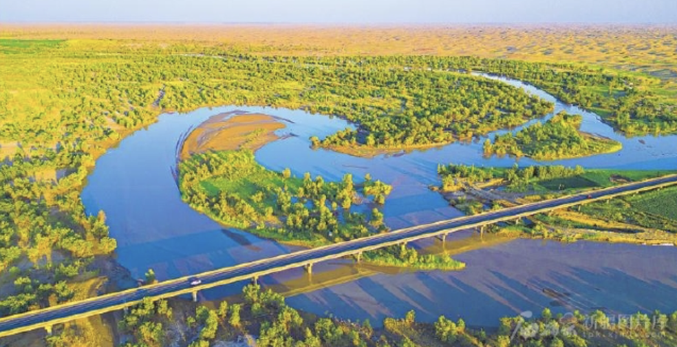 8月11日,塔里木河流域尉犁段,河水蜿蜒流淌,两岸胡杨林郁郁葱葱,流域内的湿地成为鸟类栖息的家园。 汪志鹏 摄